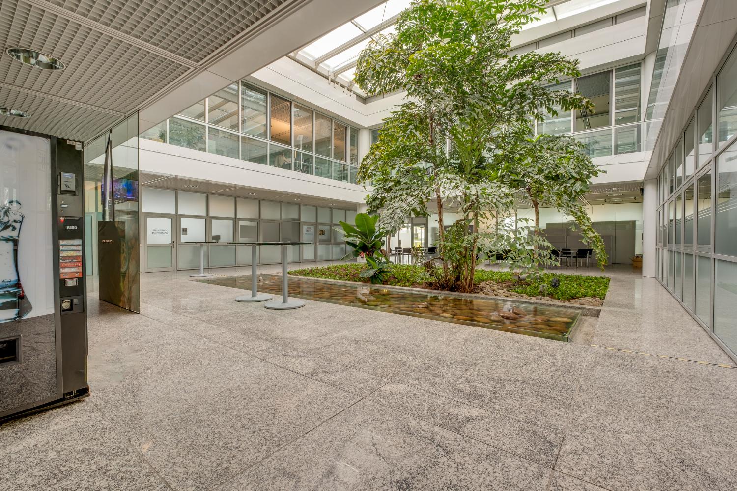 Das Gebäude zeichnet sich durch eine zweischalige Glasfassade mit integrierten Lüftungsklappen sowie ein zentral gelegenes Atrium mit intensiver Bepflanzung und Wasserbassin aus. Das Glasdach des Atriums sorgt so für ein angenehmes Raumklima und außergewöhnliches Ambiente.