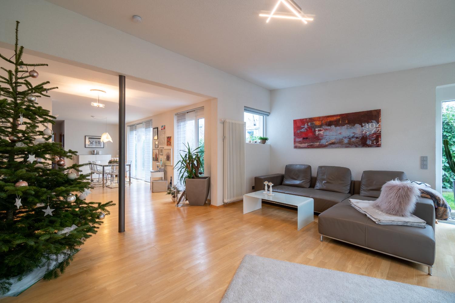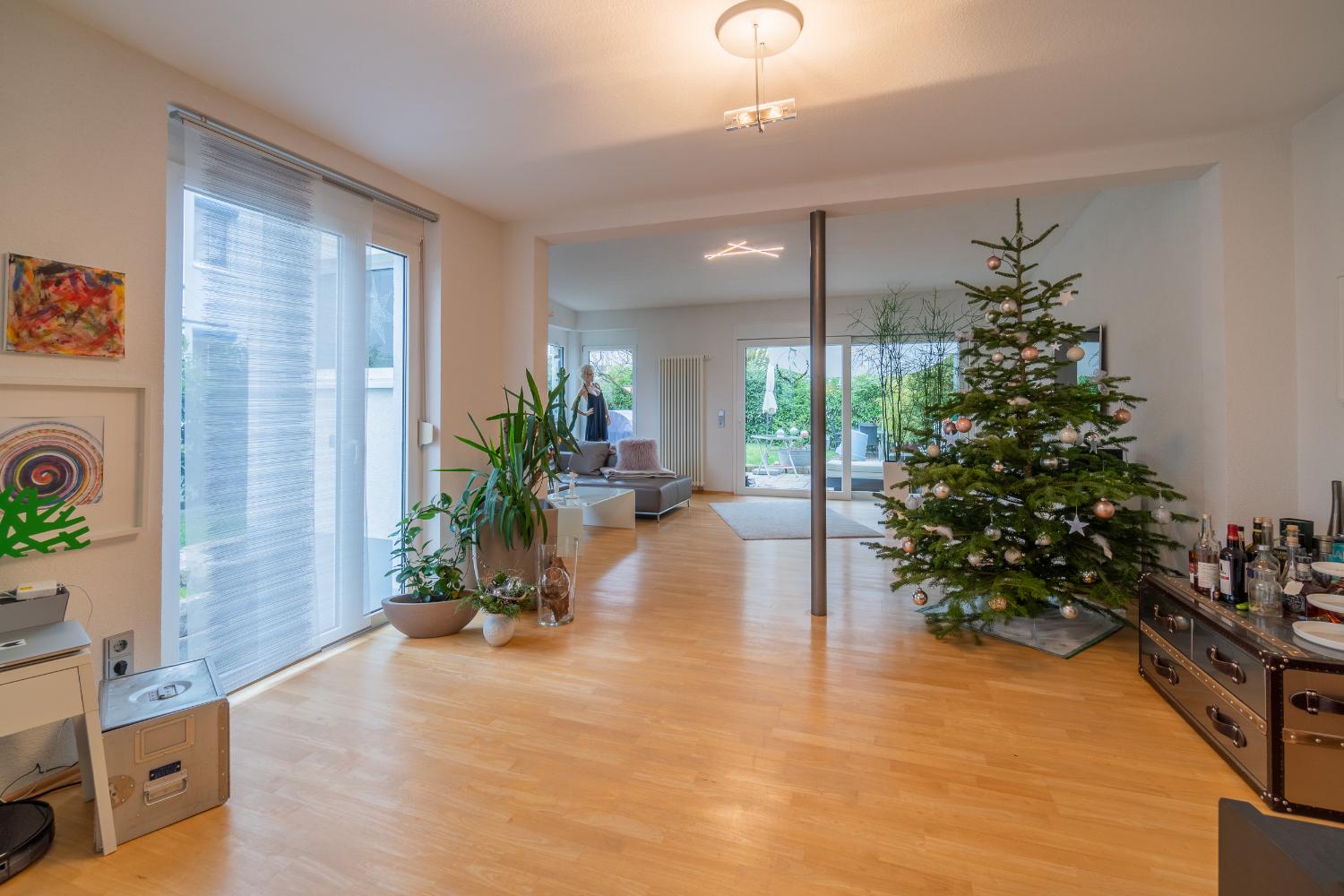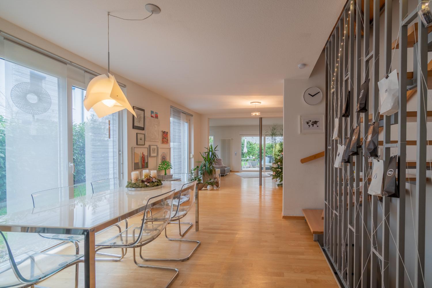 Im Erdgeschoß befindet sich der offen gestaltete Wohn-/Essbereich mit Zugang zum eingewachsenen Garten mit teilüberdachter Aussenterrasse (zur Hälfte als Wohnfläche gezählt). Hier befindet sich auch die Küche mit moderner Einbauküche und ein Gäste-WC. Das Wohnzimmer ist mit elektrischen Aussenjalousien ausgestattet.