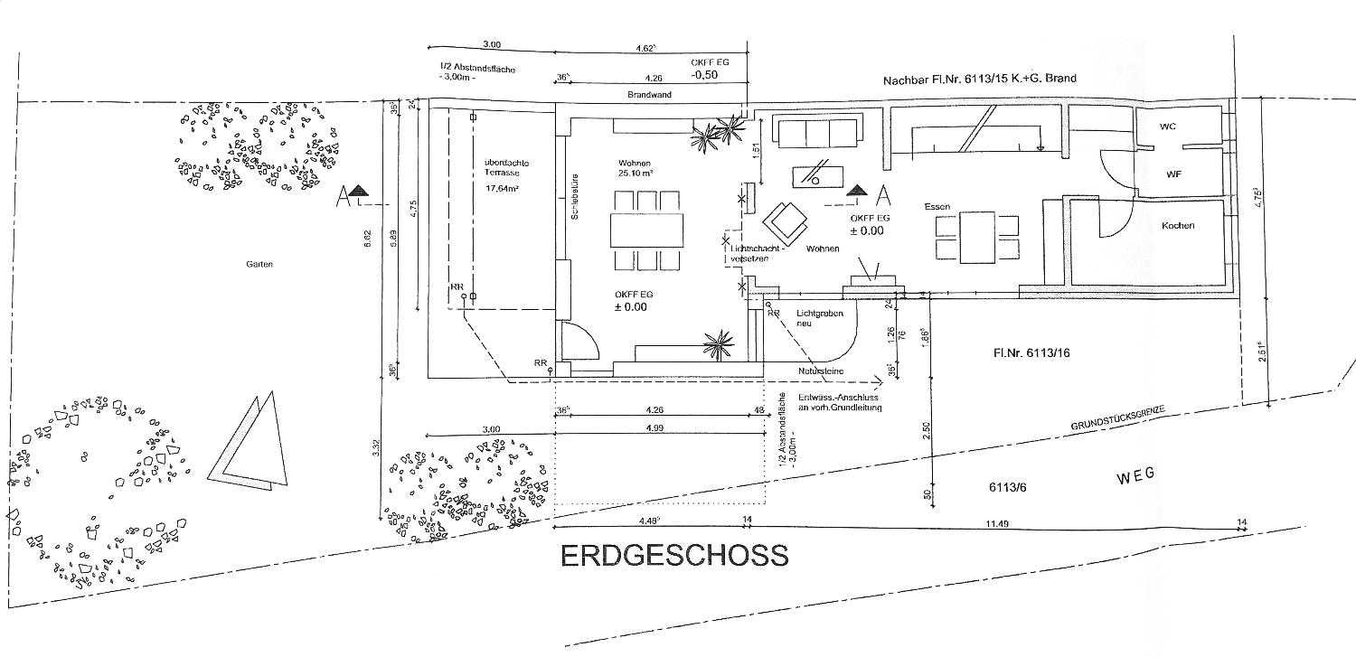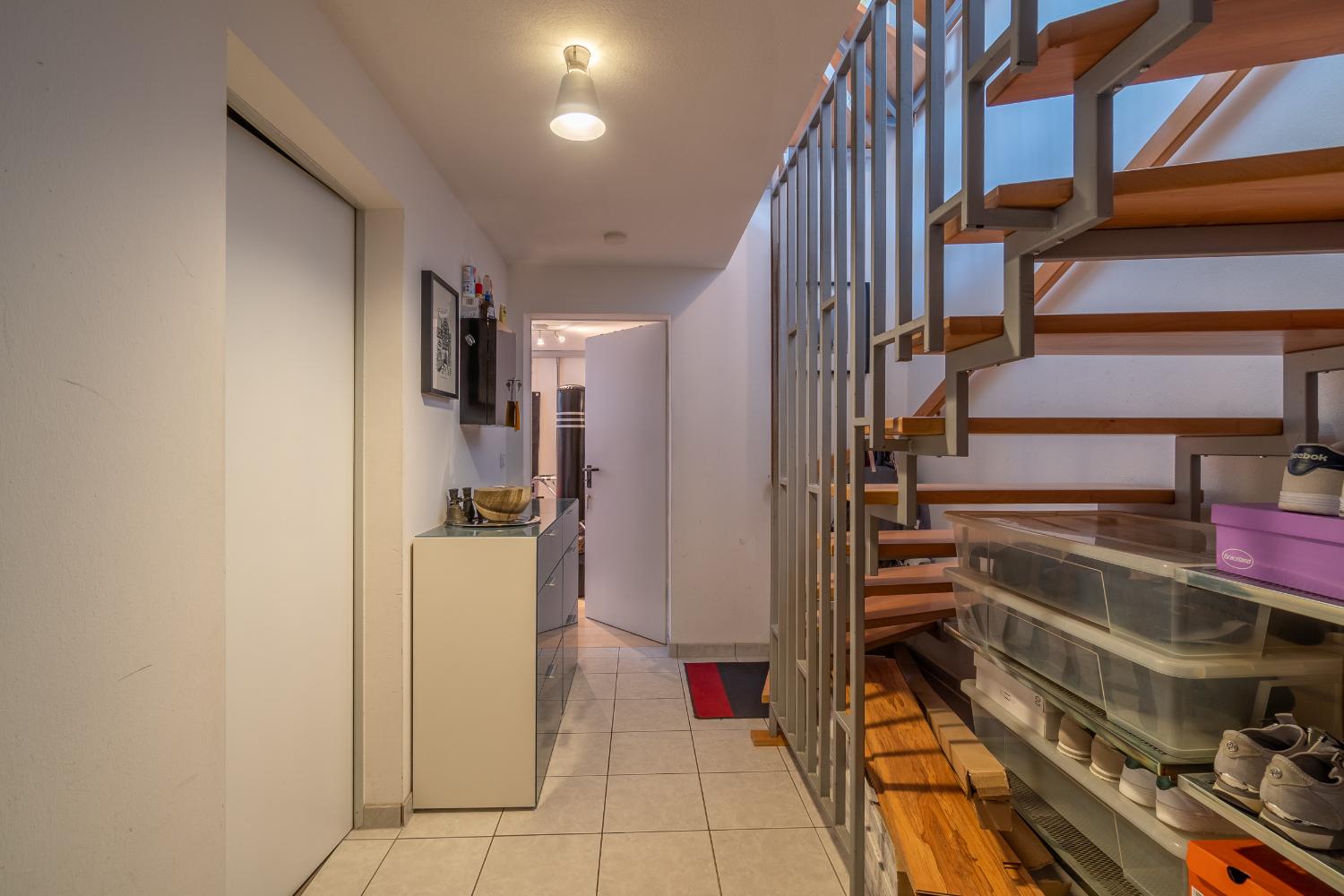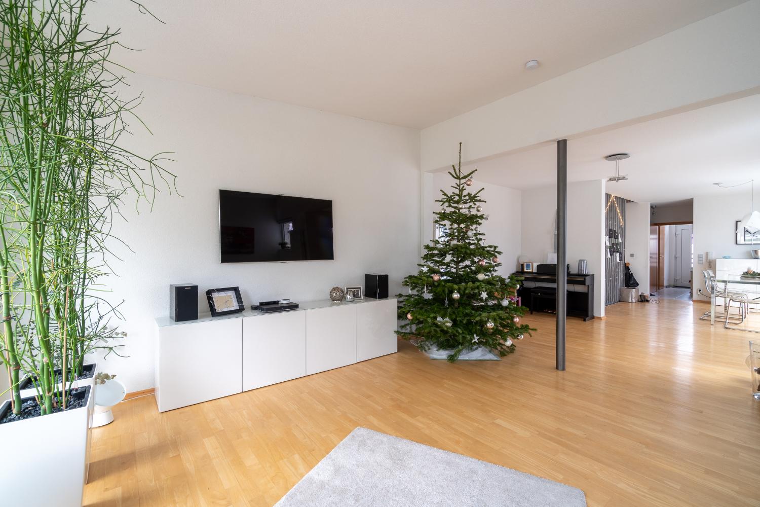 Im Erdgeschoß befindet sich der offen gestaltete Wohn-/Essbereich mit Zugang zum eingewachsenen Garten mit teilüberdachter Aussenterrasse (zur Hälfte als Wohnfläche gezählt). Hier befindet sich auch die Küche mit moderner Einbauküche und ein Gäste-WC. Das Wohnzimmer ist mit elektrischen Aussenjalousien ausgestattet.