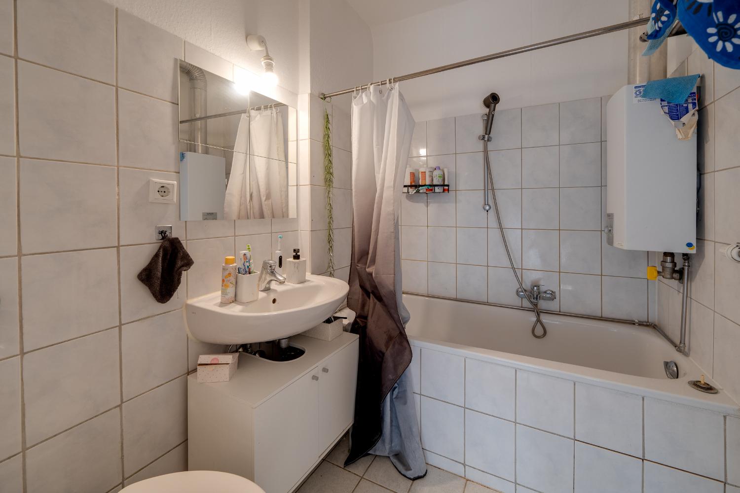 • Hell gefliestes Badezimmer mit Badewanne