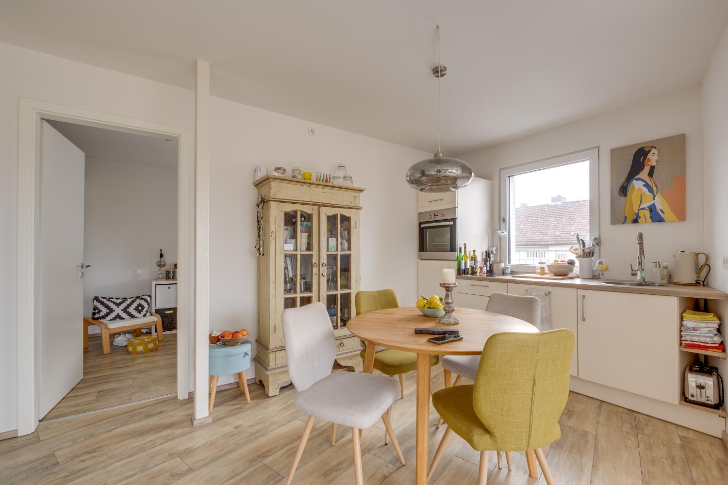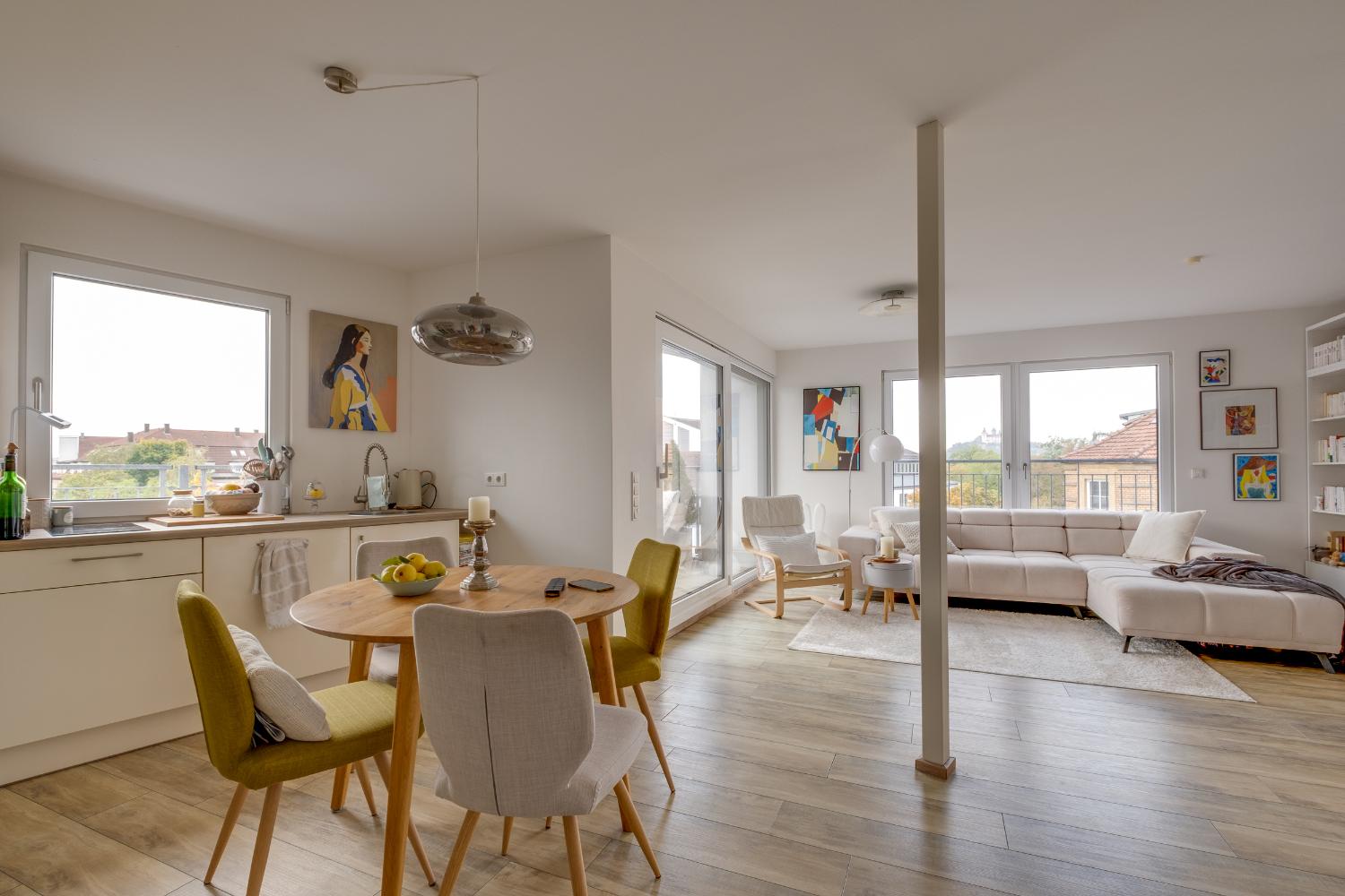 Der offen gestaltete Wohn- und Essbereich mit integrierter Küche überzeugt durch seine Großzügigkeit, Helligkeit und den direkten Zugang zur weitläufigen Dachterrasse. Hier genießen Sie Sonne von früh bis spät – mit herrlichem Fernblick bis zur Festung Marienberg.
