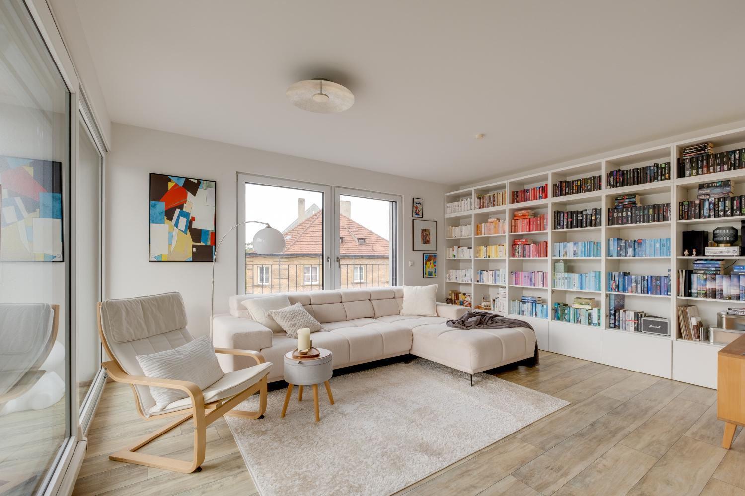 Die 2014 errichtete Dachgeschosswohnung entstand im Zuge einer hochwertigen Aufstockung eines gepflegten Altbaus aus dem Jahr 1914 und bietet eine Wohnfläche von rund 70 m².