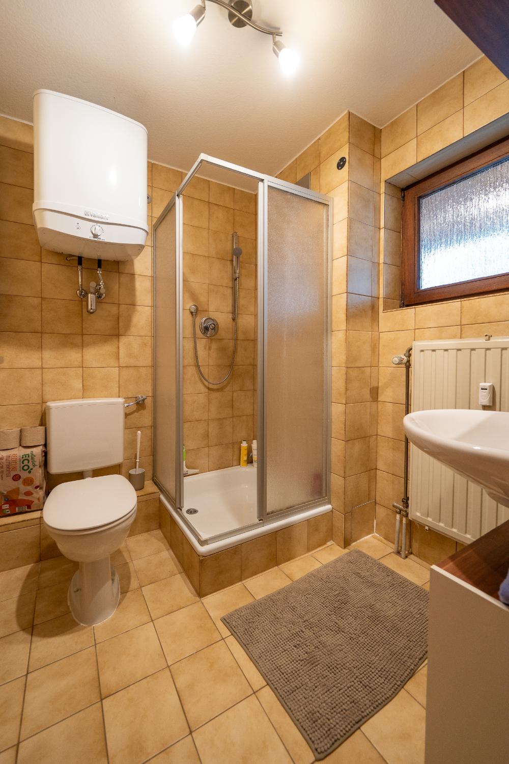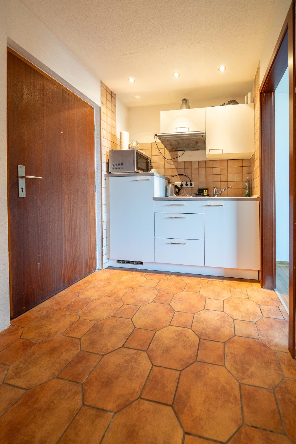 Die Küche ist kompakt und funktional ausgestattet. Das Badezimmer verfügt über Dusche, WC und Waschbecken.