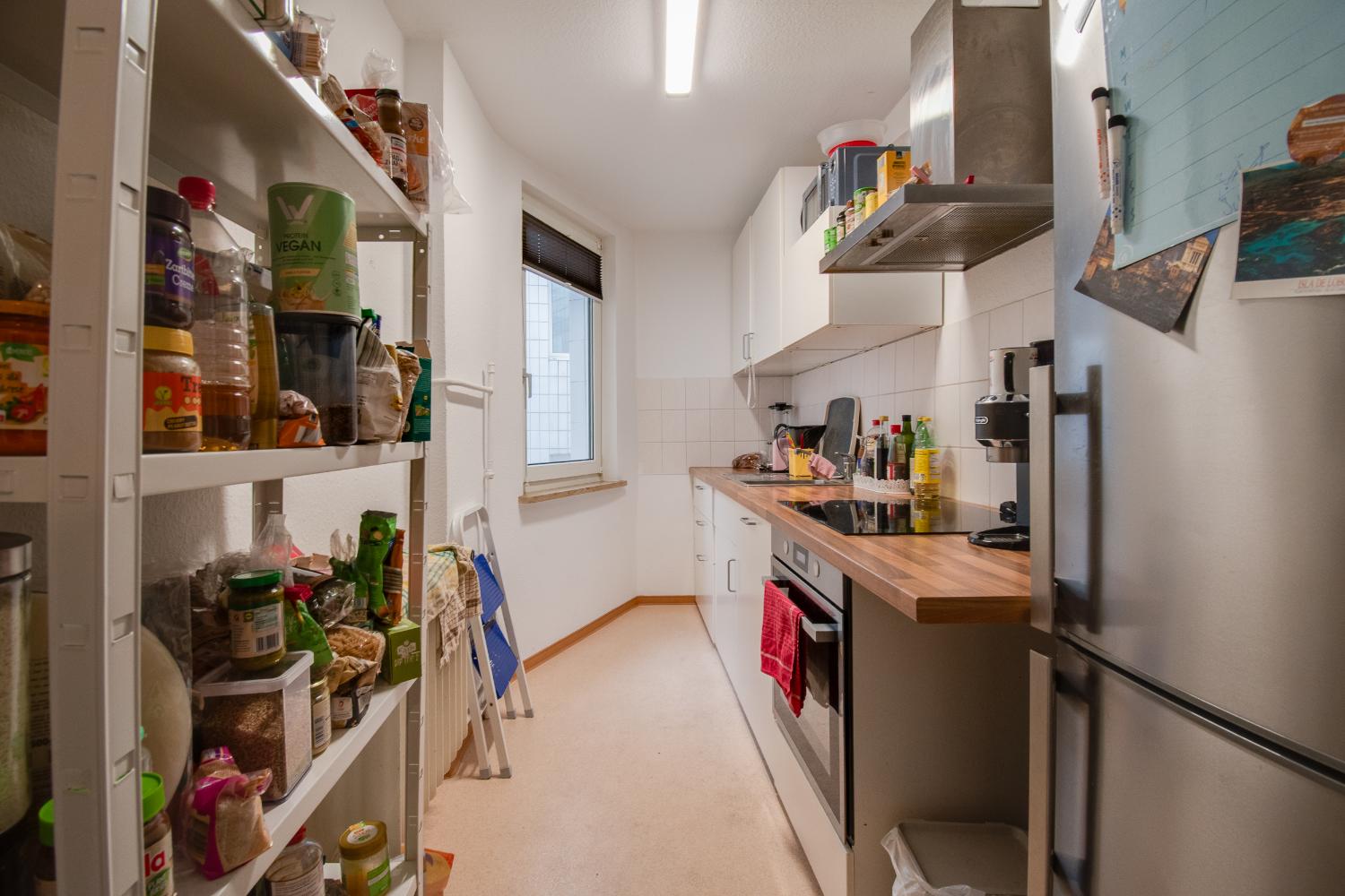 Die geräumige Küche ist mit einer Einbauküche ausgestattet, die gegen eine Ablösesumme von 1.500 € übernommen werden kann. Ideal für alle, die ohne großen Aufwand einziehen möchten.