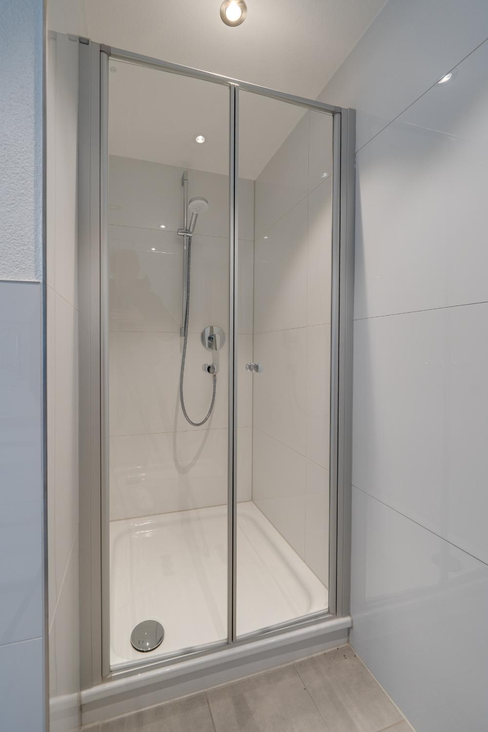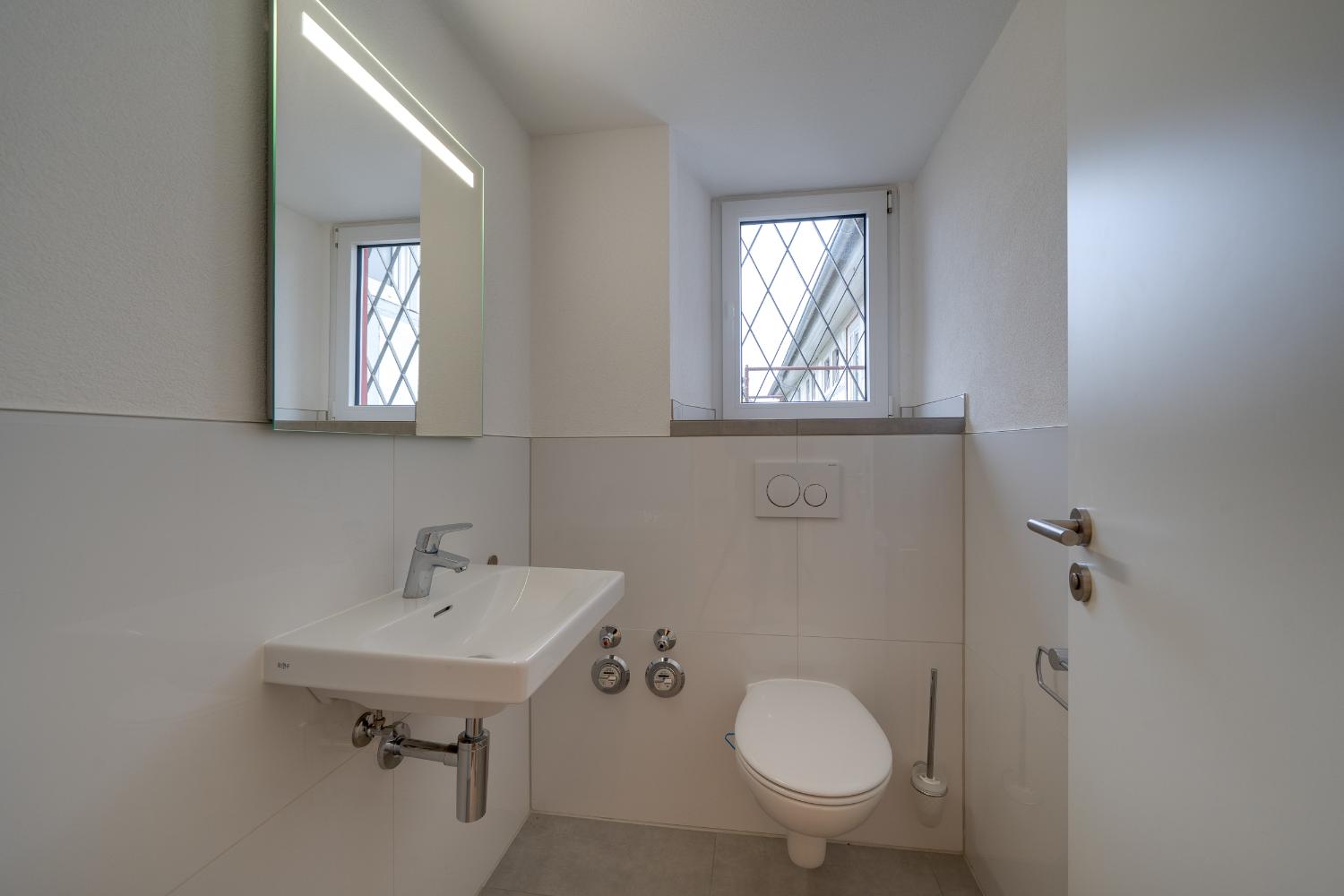Das Tageslichtbad erfüllt höchste Ansprüche: Es verfügt über eine bodengleiche Dusche, eine Badewanne, moderne Sanitärobjekte sowie hochwertige Fliesen. Ergänzend steht ein separates Gäste-WC zur Verfügung. Beide Bereiche sind hell, funktional und stilvoll gestaltet.