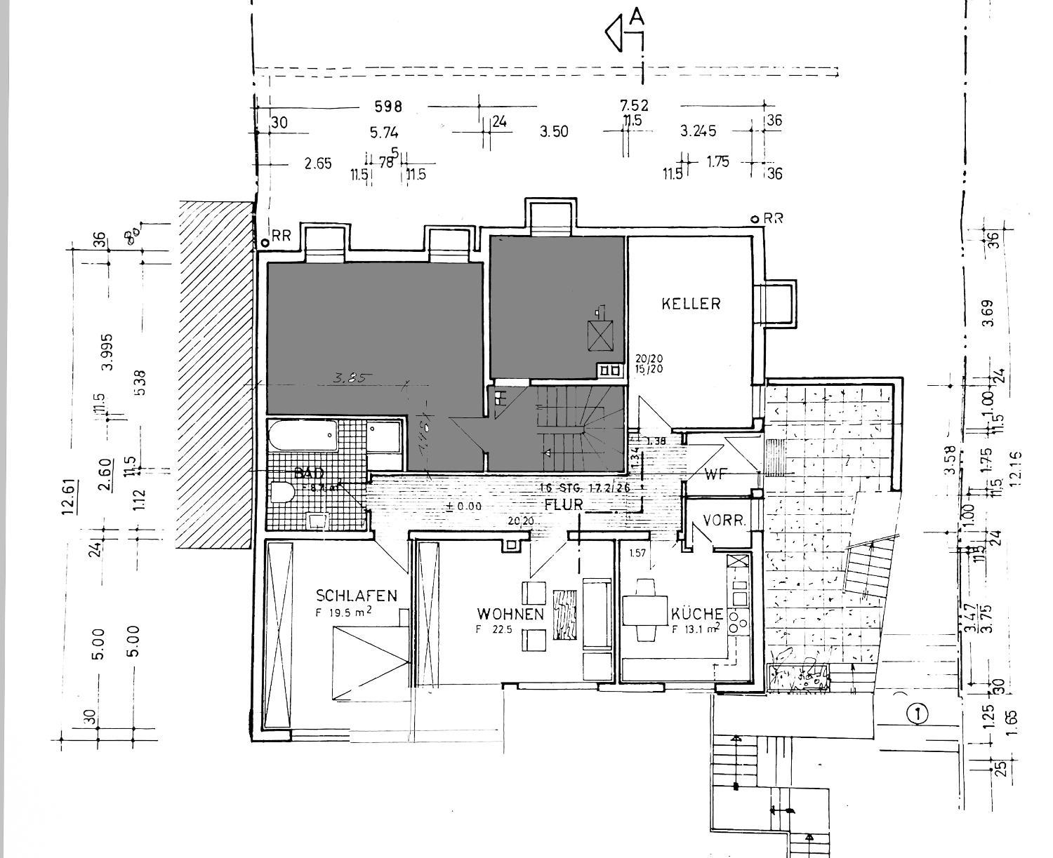 Das Schlafzimmer präsentiert sich ebenfalls hell und gut geschnitten. Die geräumige Wohnküche bietet ausreichend Platz für einen Essbereich; der Einbau einer Küche kann nach Vereinbarung erfolgen.
